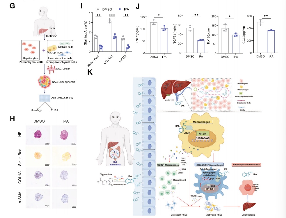 为进一步模拟和探究IPA在人体中的治疗效果,研究团队采用了朴衡博迈特有的人源化3D NAC-Organ 肝纤维化模型进行实验。通过组织学(H&E染色、天狼猩红染色)和免疫组化分析发现,IPA处理显著减轻了类器官中胶原纤维的沉积,并降低了促纤维化关键蛋白(如COL1A1和α-SMA)的表达水平。同时,通过ELISA检测模型培养上清液证实,IPA处理还显著下调了多种促炎细胞因子(如TNF-α, IL-1β)的分泌。综上,IPA在高度模拟人体肝脏复杂结构的功能性3D模型中,能够有效抑制纤维化进程和炎症反应,这不仅重复了在动物模型中观察到的表型,更关键的是它证实了IPA对人体来源的肝细胞和非实质细胞(尤其是巨噬细胞和HSC)同样具有高效的抗纤维化作用,极大地增强了研究发现向临床转化应用的说服力和潜在价值。