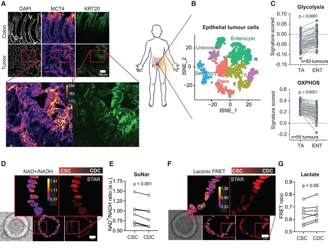 以往研究显示小鼠肠道干细胞与分化细胞存在代谢差异并通过乳酸相互作用。研究人员首先探究了人类结肠瘤中是否存在类似现象。免疫荧光结果显示与隐窝底部 KRT20⁻ 细胞相比,顶部 KRT20⁺ 分化细胞 MCT4 表达更高,表明CDCs与CSCs相比具有更高的糖酵解能力。代谢特征分析表明,分化的肠上皮细胞糖酵解水平升高,而干细胞样细胞线粒体代谢评分更高。随后团队引入基于 Wnt 的干细胞报告基因 STAR 、代谢传感器 SoNar (NAD/NADH比例)和 laconic-NLS(检测乳酸水平)(图 1)。