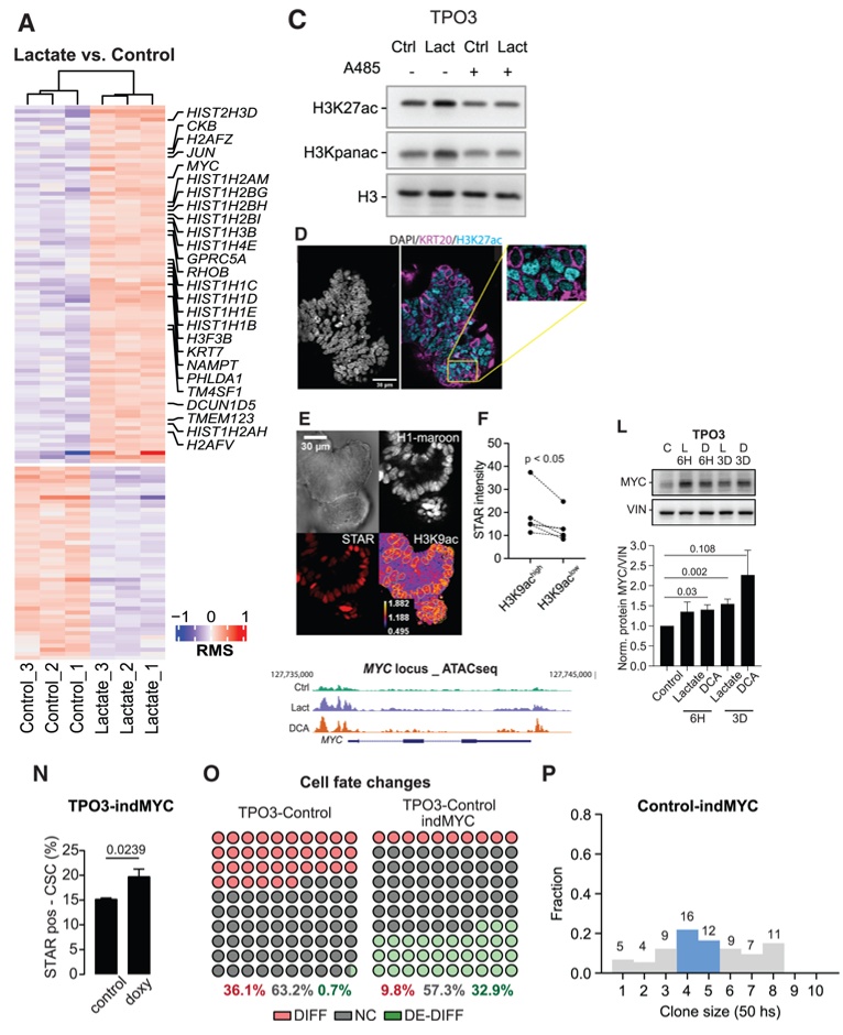 研究人员进一步研究乳酸诱导代谢重编程是否通过生物能量学以外的机制调节干性。转录组分析显示,乳酸处理肿瘤类器官后134个基因表达显著变化,包括上调的MYC、JUN与组蛋白基因。Wnt信号、增殖、迁移及染色质重塑通路显著变化。乳酸处理增加组蛋白乙酰化水平,且免疫荧光显示CDCs(KRT⁺)的乙酰化水平低于CSCs(KRT⁻),表明CSCs乙酰化程度更高。随后CHIP-seq分析显示,乳酸上调MYC、JUN、组蛋白基因的启动子区域H3K27乙酰化修饰水平。同时乳酸处理可以增加MYC染色质可及性。Western Blot证实乳酸和DCA均增加MYC蛋白水平。使用多西环素诱导MYC过表达,可增加CSCs群体、抑制分化并激活去分化。以上结果显示乳酸对干性的调节依赖于MYC表达的表观遗传调控(图3)。