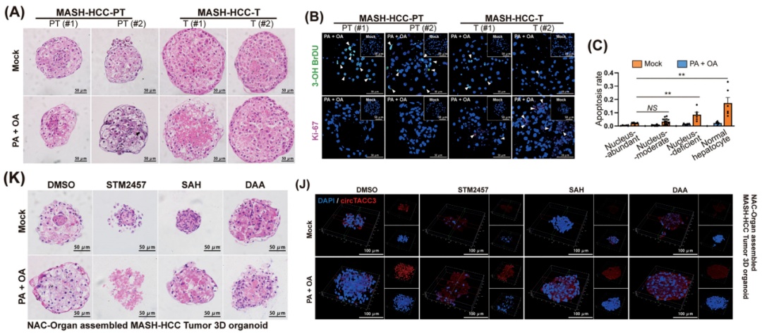 研究团队使用了NAC-Organ技术构建了MASH相关肝细胞癌组织及相应癌旁正常组织来源的3D MASH模型。结果显示在脂质过载诱导下,核内circTACC3 表达与类器官的增殖增强、脂质积累增加及凋亡减少密切相关。当使用m⁶A抑制剂(STM2457、SAH、DAA)处理MASH类器官时,不仅circTACC3的m⁶A修饰水平显著降低,其核内聚集现象也被抑制,同时类器官出现体积缩小、形态受损、脂质积累减少、增殖活性下降、凋亡率升高等表型。以上结果表明m⁶A修饰是circTACC3维持核定位及促肿瘤功能的关键,且通过抑制m⁶A修饰可逆转MASH相关肝细胞癌的恶性表型。在类器官模型中可实现连续药物处理,模拟体内长期给药的效果,相比2D细胞系的短期药物处理,更能反映药物对肿瘤细胞恶性表型的长期调控作用,为体内动物实验的药物剂量选择及干预策略提供了重要数据支撑(图2)。