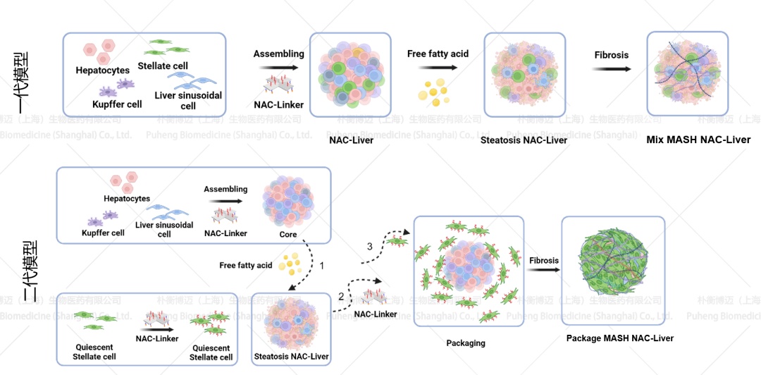 与HBV/HCV相关肝癌相比,MASH 相关肝癌具有独特的分子和免疫特征,脂质过载会引发氧化应激、复制应激及核苷酸库失衡,进而导致DNA损伤和突变积累,成为关键癌前事件。目前的研究模型主要基于动物模型,传统类器官细胞类型单一并非理想的研究工具。朴衡博迈自主研发的NAC-organ技术构建可快速构建保留患者肝实质细胞、肝窦内皮细胞、肝星状细胞、库普弗细胞的3D MASH模型(NN-HS-01),既保留临床样本的组织特异性和病理相关性,又具备稳定造模以及可操控性的优势,解决了2D细胞系不贴近体内、动物模型周期长且难以精准调控单一变量的难题。