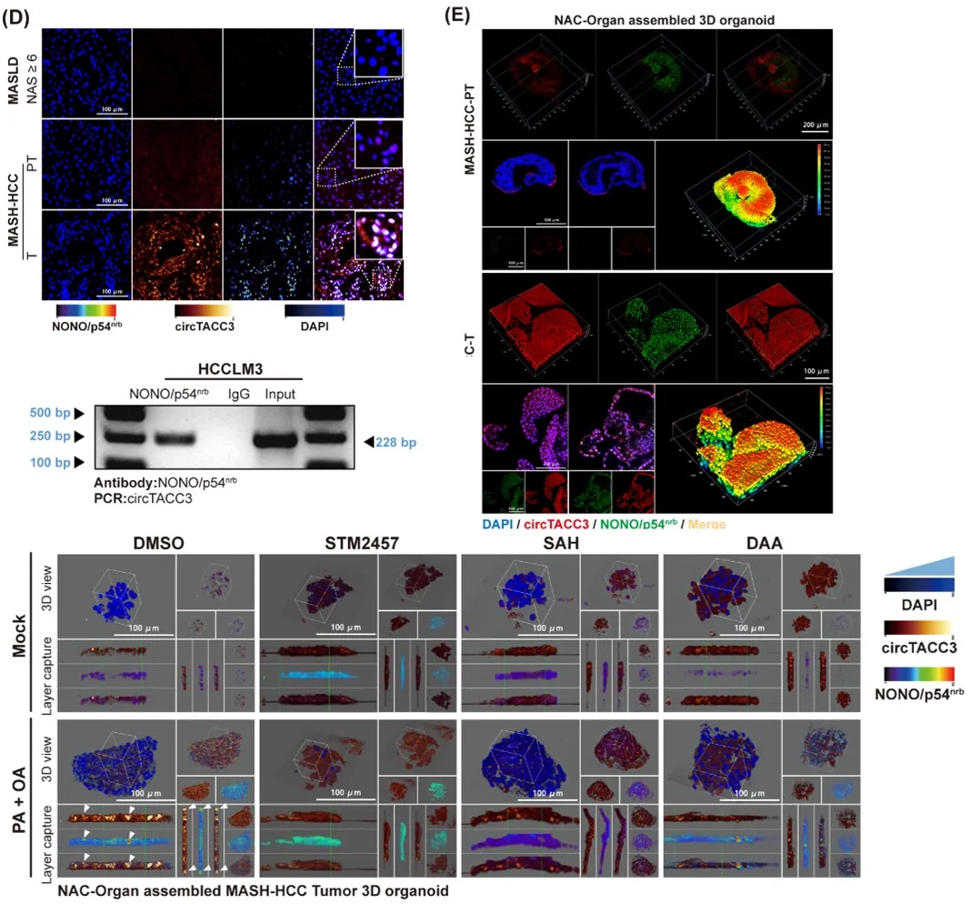研究人员使用了不同的肝癌细胞系,通过F2-circTACC3 pulldown、RIP、FLIM-FRET 等实验,证实了 circTACC3 可与 paraspeckle 核心蛋白 NONO/p54nrb直接结合,且在 PA+OA 诱导脂质过载下,二者核内共定位及聚集增强。随后为排除细胞系特异性干扰、验证上述相互作用的体内病理意义,研究团队在 MASH 相关HCC临床肿瘤组织和肿瘤组织来源的3D MASH模型中,通过免疫荧光与荧光原位杂交联合染色确认了circTACC3 与 NONO/p54nrb的共定位情况。上述结果表明,circTACC3 与 NONO/p54nrb的相互作用与共聚集并非体外细胞系的偶然现象,而是MASH相关 HCC 肿瘤组织的病理特异性特征,朴衡博迈构建的患者来源的3D MASH模型能精准还原该临床病理特征(图3)。