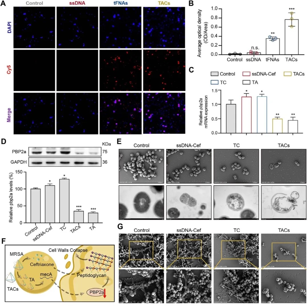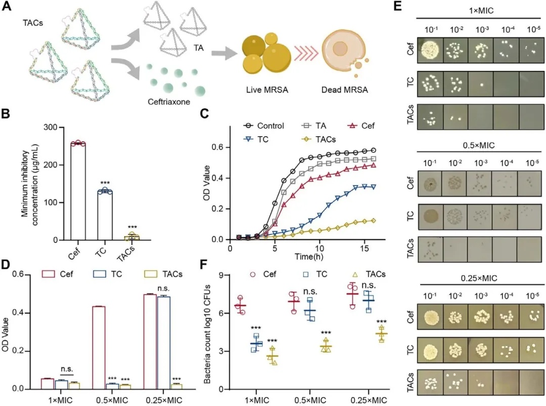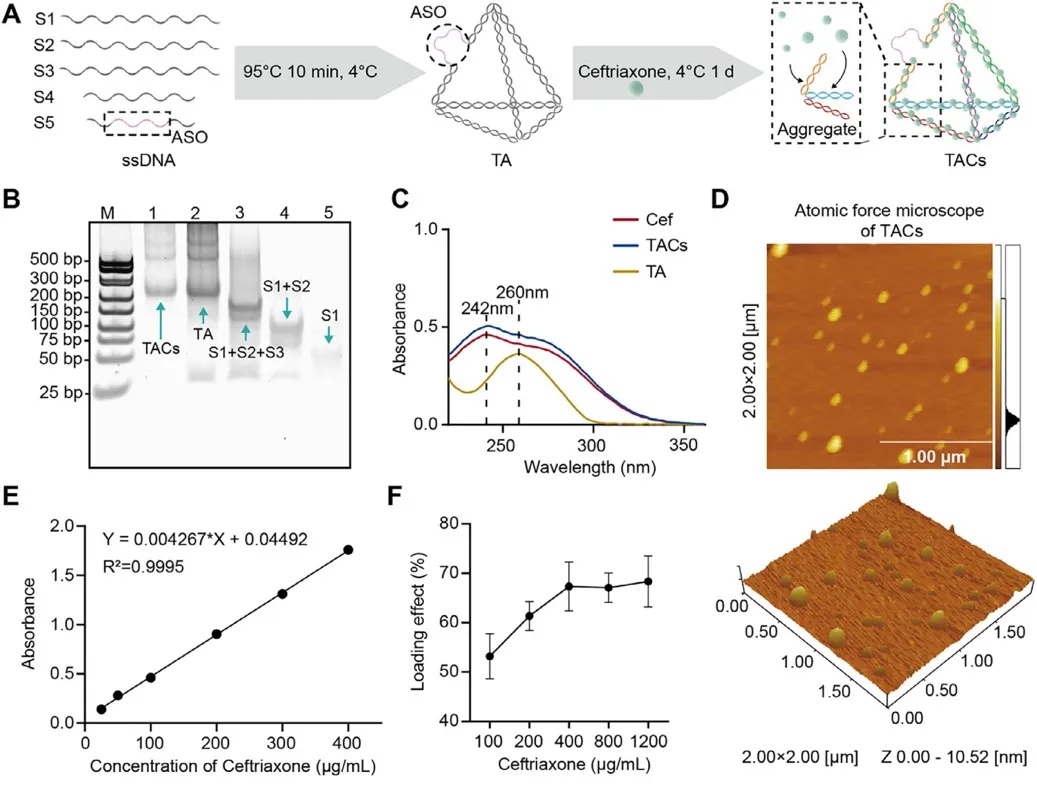 团队设计的 TACs 由 tFNAs、靶向 mecA 基因的 ASOs 与头孢曲松钠共组装形成,通过受控聚集实现药物稳定负载与缓释。凝胶电泳证实核酸材料组装成功,紫外吸收光谱表明头孢曲松钠成功负载,原子力显微镜观察到其呈均匀四面体结构。性能上,药物负载效率在头孢曲松钠浓度达 500 μg/mL 后稳定,体外释放实验中 48 小时累积释放率 69.3%,显著优于游离头孢曲松钠;动态光散射检测显示其粒径 33.31±1.10 nm、zeta 电位14.37±0.71 mV,结构稳定(图1)。