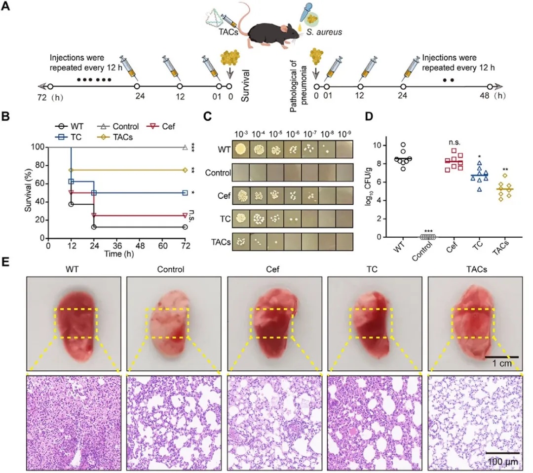 在模式生物感染模型中,TACs展现卓越治疗效果,显著改善感染预后。使用小鼠肺炎模型,经鼻滴注致死剂量 MRSA 后,TACs 处理组小鼠 72 小时存活率达 80%,显著优于对照组与游离头孢曲松钠组,亚致死剂量感染下,TACs 处理使小鼠肺组织细菌负载大幅下降,病理分析显示其能显著减轻肺组织充血与炎症细胞浸润、恢复肺组织弹性(图5)。