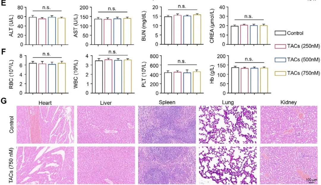 动物水平验证表明,TACs 生物相容性优异,无显著毒副作用。C57BL/6J 小鼠尾静脉注射 750 nM TACs 后,肝肾功能指标与血常规参数均在正常范围,心脏、肝脏、脾脏、肺、肾脏的 H&E 染色切片显示组织结构完整,无炎症浸润或组织损伤(图4)。