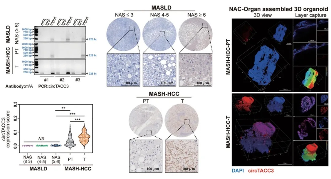 本研究首次系统揭示了m⁶A 修饰介导的circTACC3–paraspeckle–R 环正反馈通路在MASH 相关肝癌中的核心作用。通过临床样本、肝癌细胞及3D MASH类器官模型的多层验证,研究表明circTACC3是该疾病的特异性分子标志物,其通过调控核内RNA–DNA杂交结构促进基因组重塑与肿瘤进展。类器官模型的引入使得研究更贴近真实代谢病理环境,为MASH相关肝癌的早期诊断与靶向干预提供了可行的新方向,也为探索代谢相关实体瘤的核内RNA调控机制奠定了重要基础。