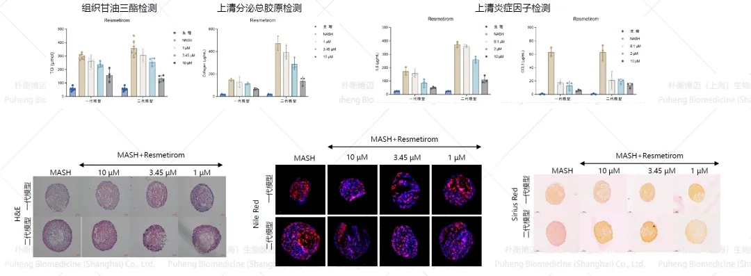 朴衡博迈自主研发的3D MASH模型中包含肝实质细胞、肝窦内皮细胞、肝星状细胞与库普弗细胞,经MASH培养基诱导后呈现出符合MASH病理特征的典型表型:包括脂肪变性、气球样变、炎症反应以及纤维化。根据不同试用场景我们分为3D MASH一代模型(NAC-MASH MIX,NN-HS-01)与3D MASH二代模型(NAC-NASH Package,NN-HS-02)。其中一代模型直接将肝实质细胞、肝窦内皮细胞、肝星状细胞与库普弗细胞混合造模。二代模型首先构建肝实质细胞、肝窦内皮细胞与Kupffer细胞的核心,随后加入肝星状细胞构建外壳,能更好地模拟MASH进展过程中的外周纤维化状态(图1)。该3D MASH 模型可对多类药物处理产生多维响应,从抑制脂滴生成、炎症反应到纤维化进展等方面综合评估药效,亦是药物毒性测试、药物筛选、代谢干预与信号通路验证的理想平台(图2)。