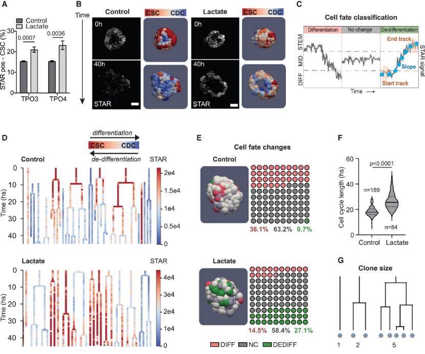 肿瘤微环境的显著特征是低葡萄糖和高乳酸水平。前期研究发现CDCs和CSCs通过乳酸相互作用。团队开发了 CellPhenTracker,一种利用机器学习驱动的4D单细胞追踪技术来观测细胞增殖、细胞命运。使用两株患者来源的肿瘤类器官TPO3、TPO4类器官研究乳酸在肿瘤发展中的作用。结果显示补充乳酸可以显著增加类器官中CSCs细胞群体。为研究乳酸诱导干性的机制,研究人员对STAR-TPO3类器官肿瘤发育进行了4D成像。将所有细胞分为分化、去分化和未改变三类。观察发现在对照条件下,类器官中的CSCs随时间减少,并且CSCs减少是由于细胞分化导致。36%的细胞转变为分化状态,去分化状态细胞比例较低。在乳酸条件下,细胞分化显著降低,去分化显著增加。以上结果说明乳酸诱导的CSCs通过分化抑制和显著诱导CDCs回归CSCs状态完成(图2)。