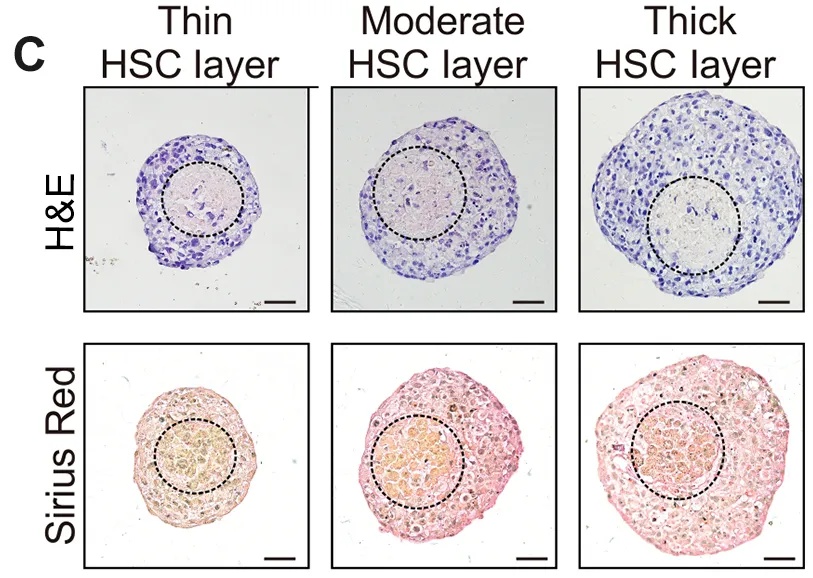 目前基于肝纤维化模型的病理及药物研究局限性较强,例如2D细胞培养过于简单,无法模拟肝非实质细胞与肝实质细胞在复杂三维空间中的相互作用。传统肝类器官3D模型通常细胞种类单一,缺乏关键免疫组分且难以主动诱导纤维化以用于疾病造模。动物模型周期长、种属差异大,其致病机制与人类临床存在差距。因此,能够整合多种细胞类型、高度模拟体内真实微环境的3D肝纤维化模型,将是精准研究疾病机制和药物筛选的理想工具。